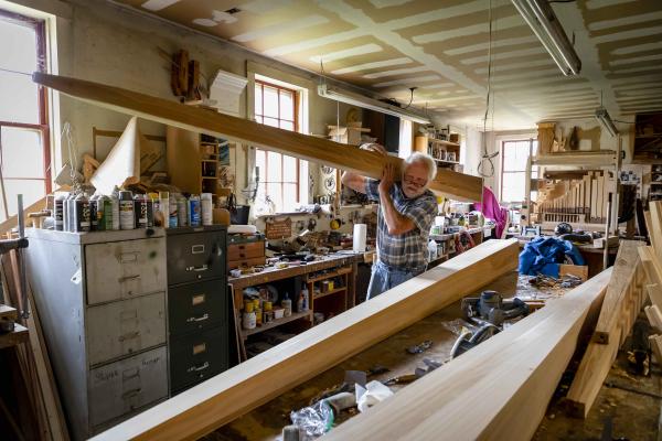 A, David Moore carrying one of the 16′ Trombone pipes from wood shop to erecting room (photo credit: Steve Riskind). All photos may be viewed in the digital, PDF, or print editions.