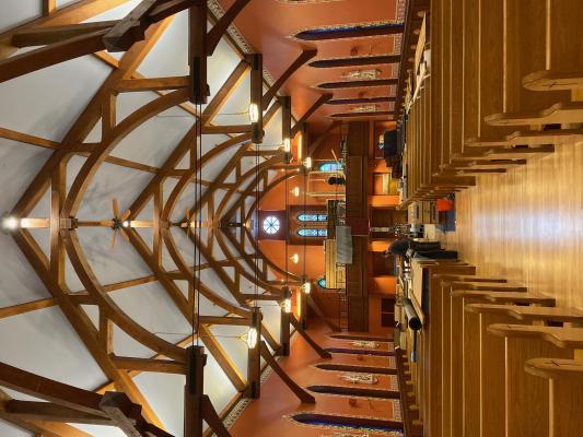 The finished church building is lovely. The windows and oak wainscoting are bordered with attractive and colorful stenciled patterns, the walls are painted a rich brick red, new light fixtures with fancy controls and state-of-the-art bulbs illuminate the place effectively, and an intricate system of wood trusses supports the pitched ceiling, a huge change from the tacky dropped ceiling in the original building.