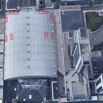 Photo caption: Boardwalk Hall showing the locations of organ chambers and the adjacent Trump Hotel: 1, Right Stage chamber: Great, Solo, Solo-Great, Grand Great, Pedal Right; 2, Right Forward chamber: String II, Brass Chorus; 3, Right Center chamber: Gallery I, Gallery II; 4, Right Upper chamber: Echo; 5, Left Upper chamber: Fanfare, String III; 6, Left Center chamber: Gallery III, Gallery IV; 7, Left Forward chamber: Choir; 8, Left Stage chamber: Swell, Swell-Choir, Unenclosed Choir, String I, Grand Choir, Pedal Left. (photo credit: Historic Organ Restoration Committee)