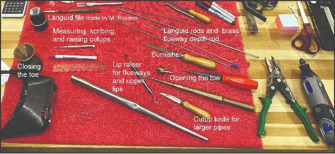 One of our oft-repeated sayings at Fisk is, “Why go half-way when you can go too far?” It has a logical corollary: “You never know that you have gone too far until you do,” sometimes phrased as, “You can’t find the middle until you know where the edges are.” The concept also applies in the microcosm of voicing. The type of sound that Charles Fisk was trying to achieve in the Opus 75 Great principal chorus was that of Gottfried Silbermann, and that meant that he wanted to cutup the pipes perhaps higher than some voicers would consider “safe.” He was not naïve, he knew that “just right” is just shy of “too far.” Those who knew him well testify that he was constantly pushing the limit of possibility in the quest for his concept of excellence. When the crew for this project had the façade pipes down, cutting them apart to lower their cutups, we found one that had clearly been cut up too high, and then had had a piece of metal soldered onto the upper lip, and the cutup process started again. We think that this was Charlie’s “mea culpa” and a clear indication that he was aware that he had gone just a bit too far. We didn’t see this until we had already made the decision to lower all the façade cutups, but after a wry laugh, we realized that it gave us the confidence to do this work without any reservation.