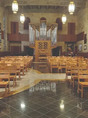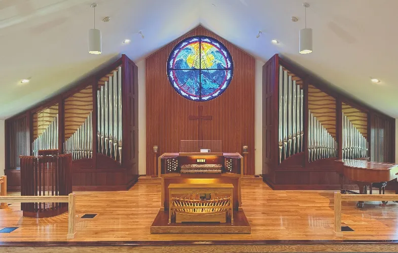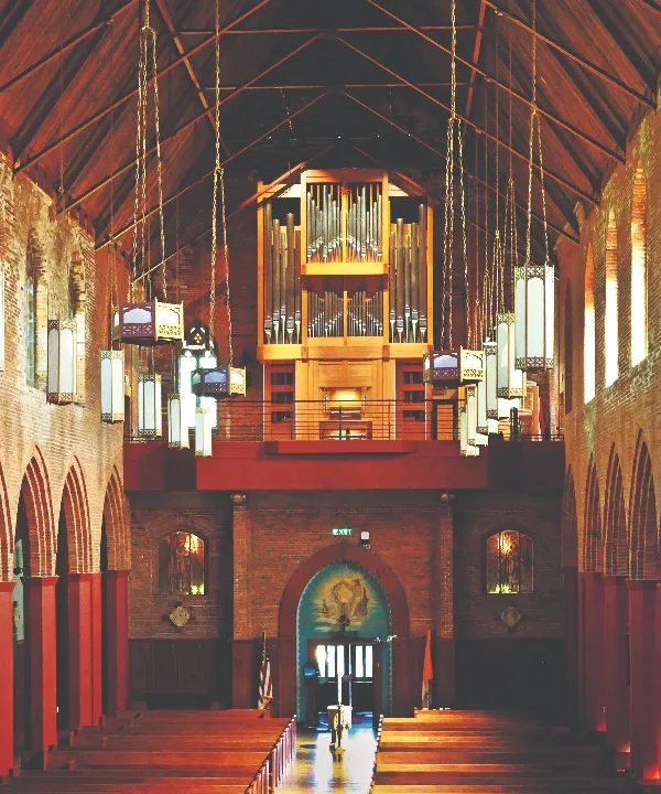 Saint Peter’s interior, designed by Lella and Massimo Vignelli, is said to be one of the finest examples of late mid-century modernism. For the Vignellis, it was important that the space be flexible in order to serve the established purposes of Lutheran liturgy and much more. Their vision allows the sanctuary to serve as a house of worship as naturally as a place for concerts, lectures, performances, meetings, and community gatherings. Johannes Klais Orgelbau in Bonn, Germany, was commissioned to build a two-manual, 32-stop mechanical-action organ for the new sanctuary. Klais worked in tandem with the Vignellis on the case and console designs, resulting in an organ uniquely integrated into its architectural setting.