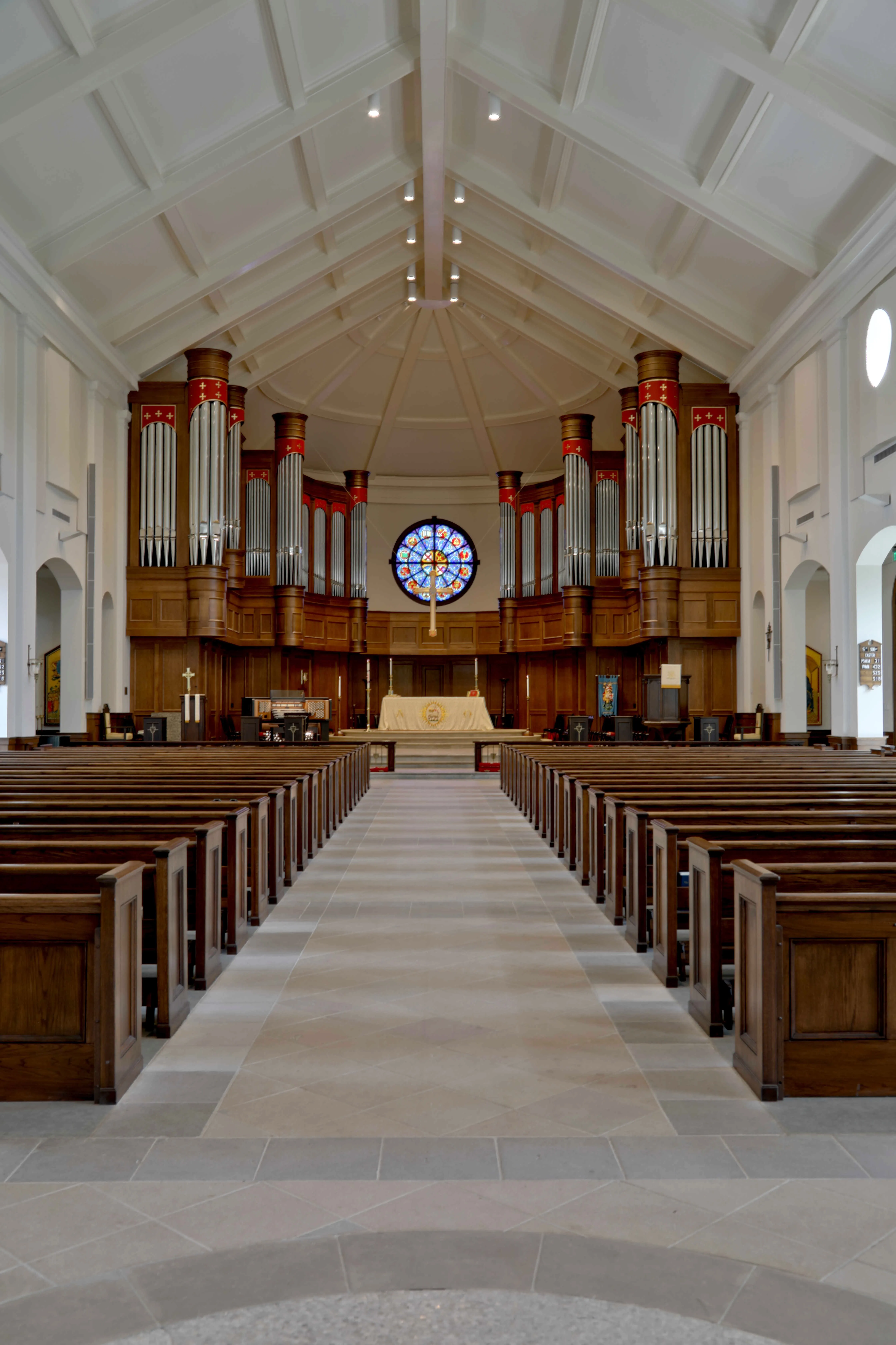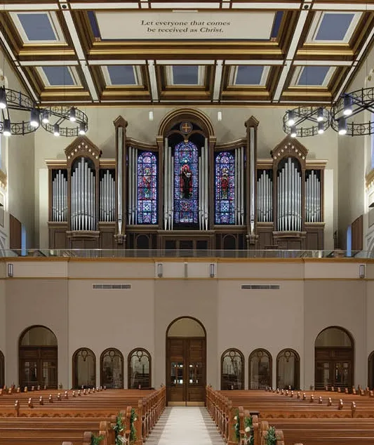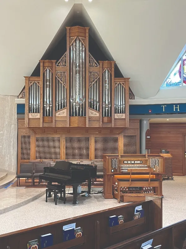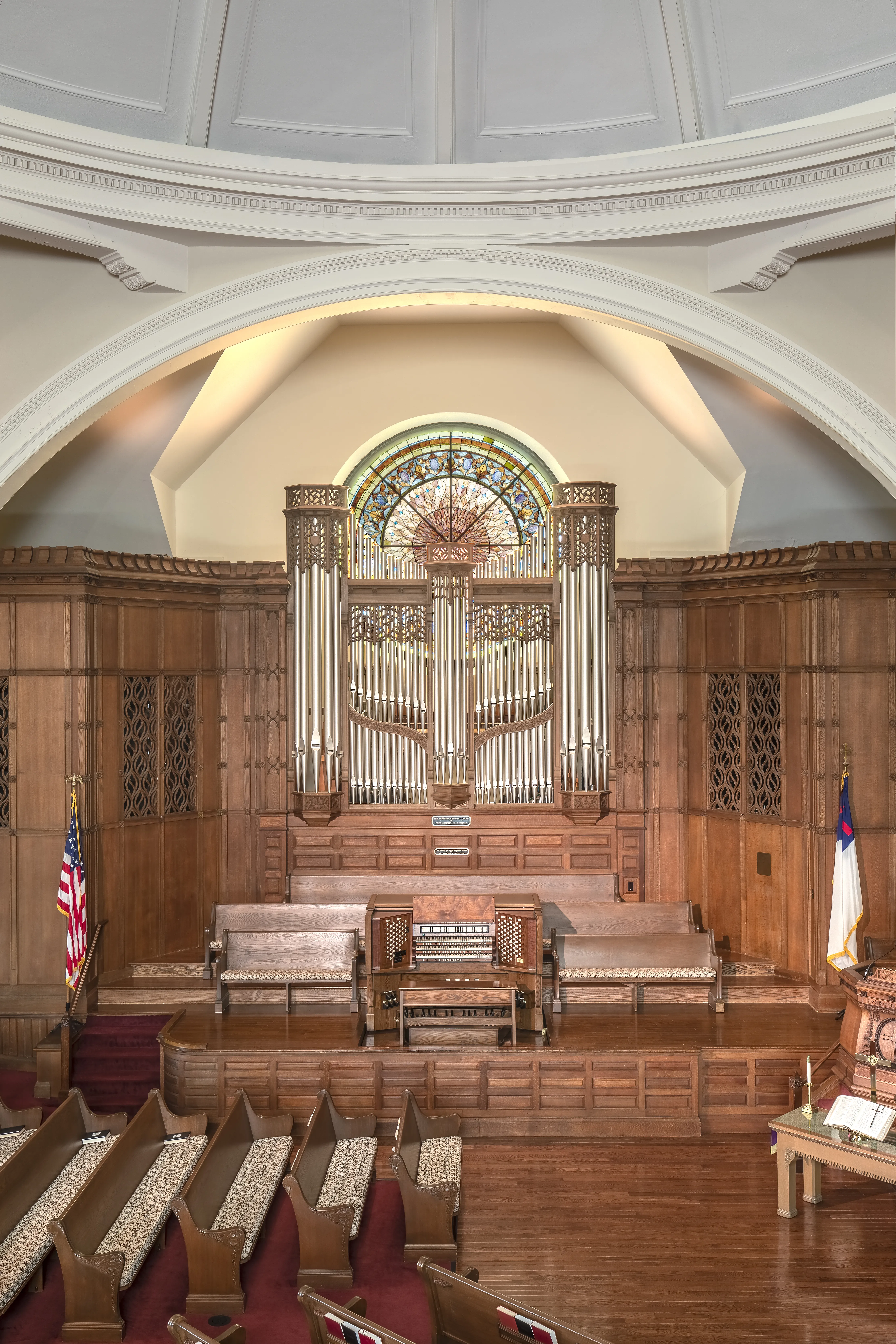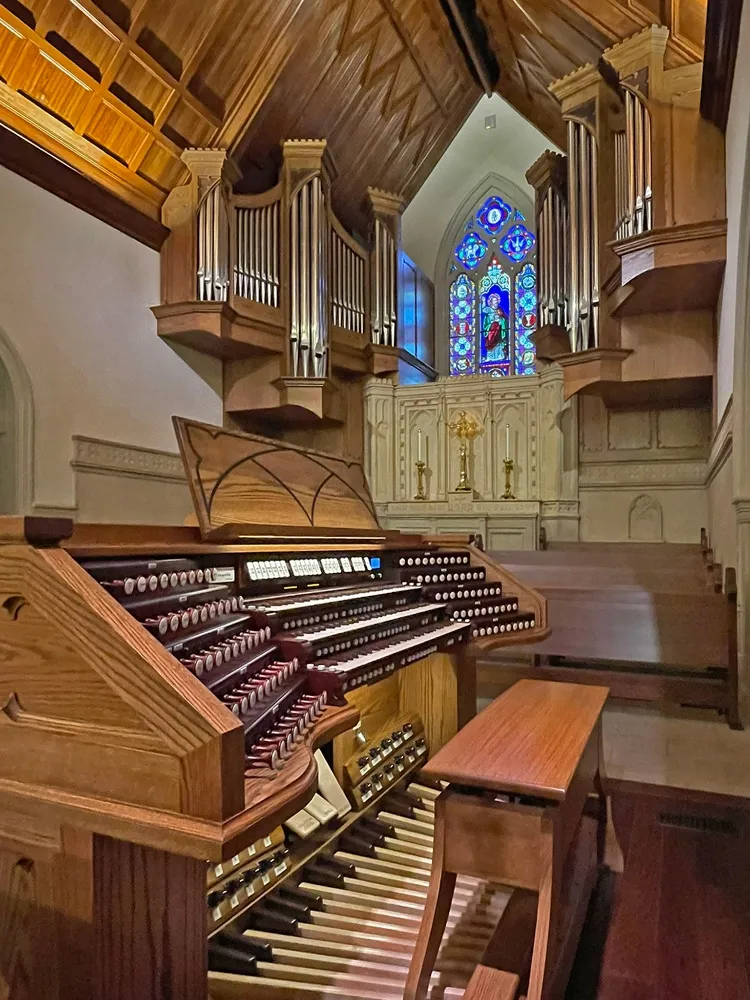 The case is built of solid white oak using traditional joinery and moulding. It stands nearly fourteen feet tall, cantilevered on steel beams three feet into the chancel. Bass pipes of the Great Diapason, of heavy spotted metal, form the façade, their tops hidden behind delicate pipeshades of repeating gothic design. Having pipes on the front and both sides maximizes the tonal egress.