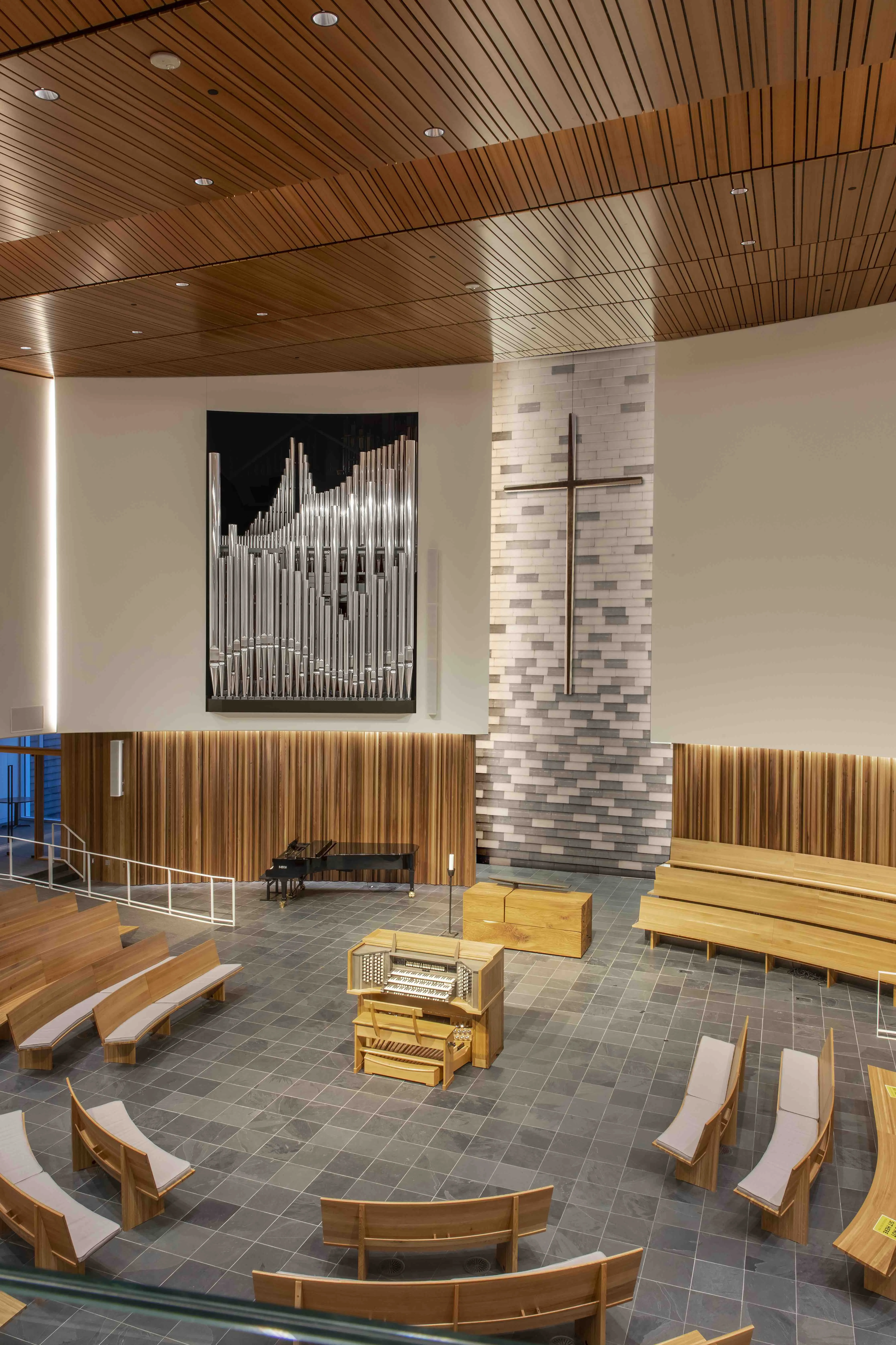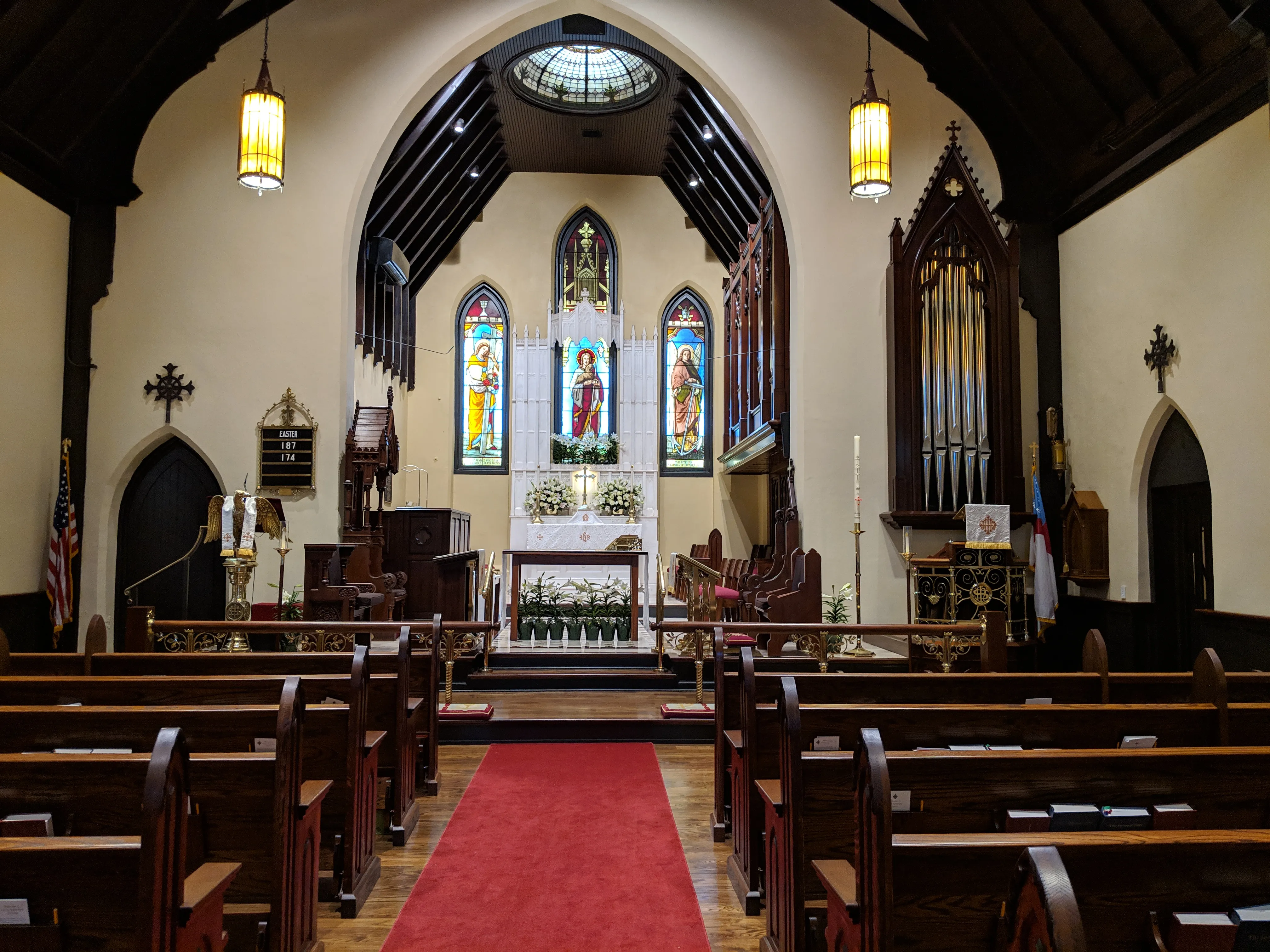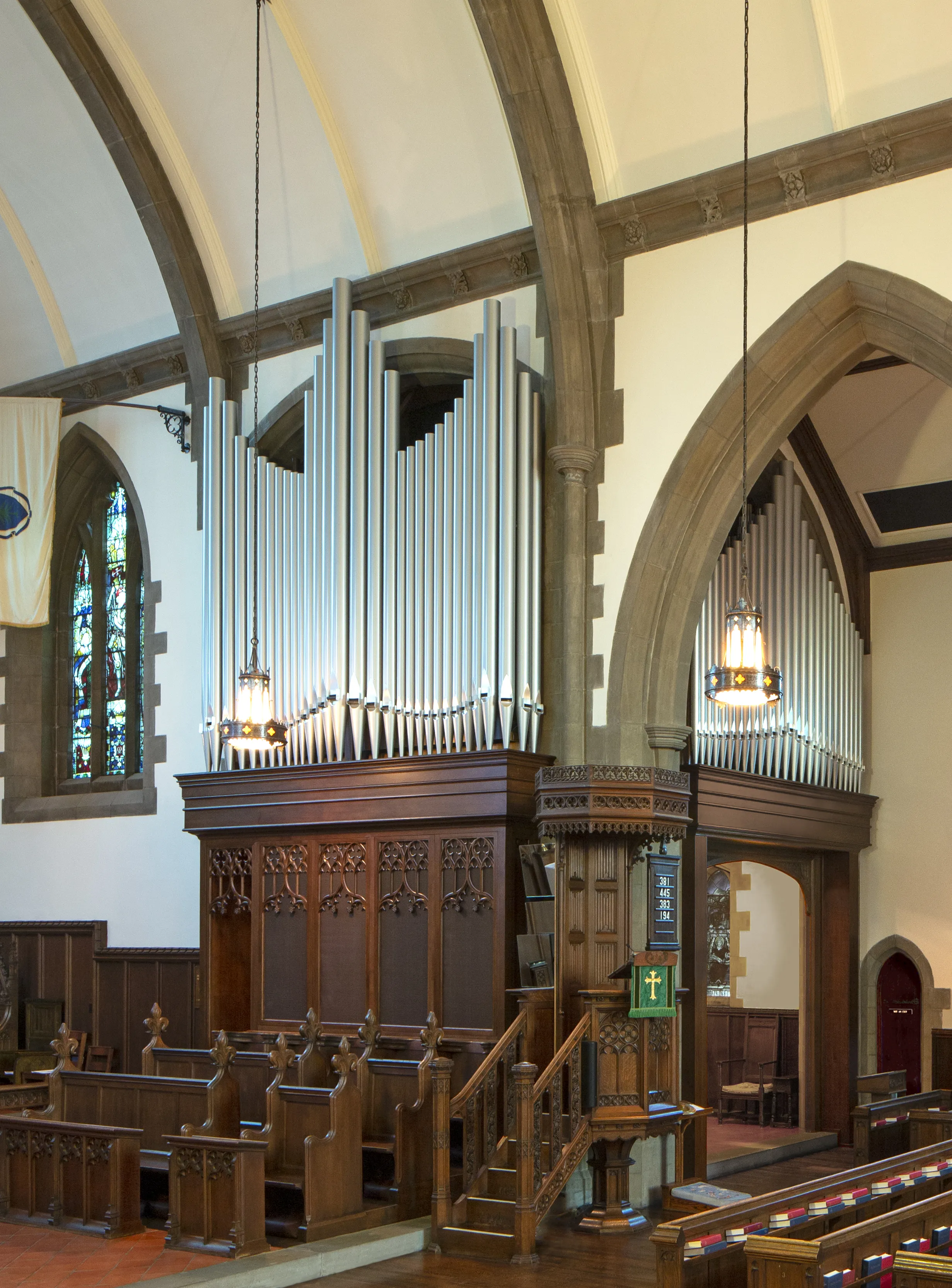 The case is built of solid white oak using traditional joinery and moulding. It stands nearly fourteen feet tall, cantilevered on steel beams three feet into the chancel. Bass pipes of the Great Diapason, of heavy spotted metal, form the façade, their tops hidden behind delicate pipeshades of repeating gothic design. Having pipes on the front and both sides maximizes the tonal egress.
