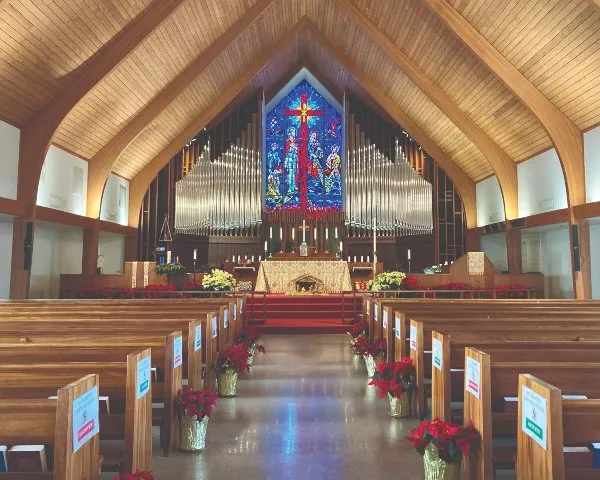 Surrounded by the campus of Williams College in the Berkshire mountains of Western Massachusetts, Saint John’s fieldstone building is at one with its bucolic setting. Built in 1896, the church is of modest size, but with exquisite adornments: angel-headed winged hammer beams, a carved reredos with mosaics depicting Jesus and Mary, and a stunning collection of stained glass from the studios of Tiffany, La Farge, and Connick.