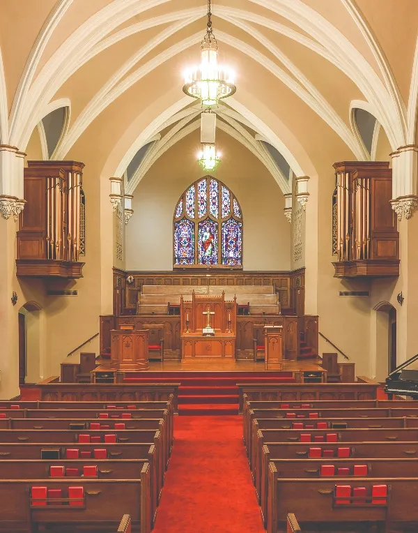 The space given for the organ is a chamber roughly six by eight feet on one side of the apsidal chancel, once housing Skinner’s six-stop Opus 792 of 1929. In 1965 M. P. Möller rebuilt the organ, adding an unenclosed Great in a cantilevered flower box. In this new iteration, half the instrument spoke down the nave and the other half into the chancel, resulting in a confusing and un-blending jumble. The poorly insulated chamber bedeviled organ curators’ attempts at tuning, though not nearly as much as the nearly nonexistent service access. When the Möller started failing, it became clear the time had come to start over.