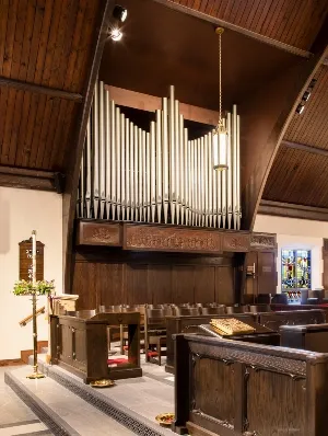 Following a period of discussion, the decision was taken to build an organ entirely under the control of expression shutters. While this firm had not, until now, built a fully enclosed instrument, this uncommon practice is experiencing a centennial revival and showed merit in this situation. The existing organ had been completely enclosed, yet its two-rank mixture and narrowly scaled, fractional-length reeds were perceived as painfully harsh by the choir members who sat in front of the organ.