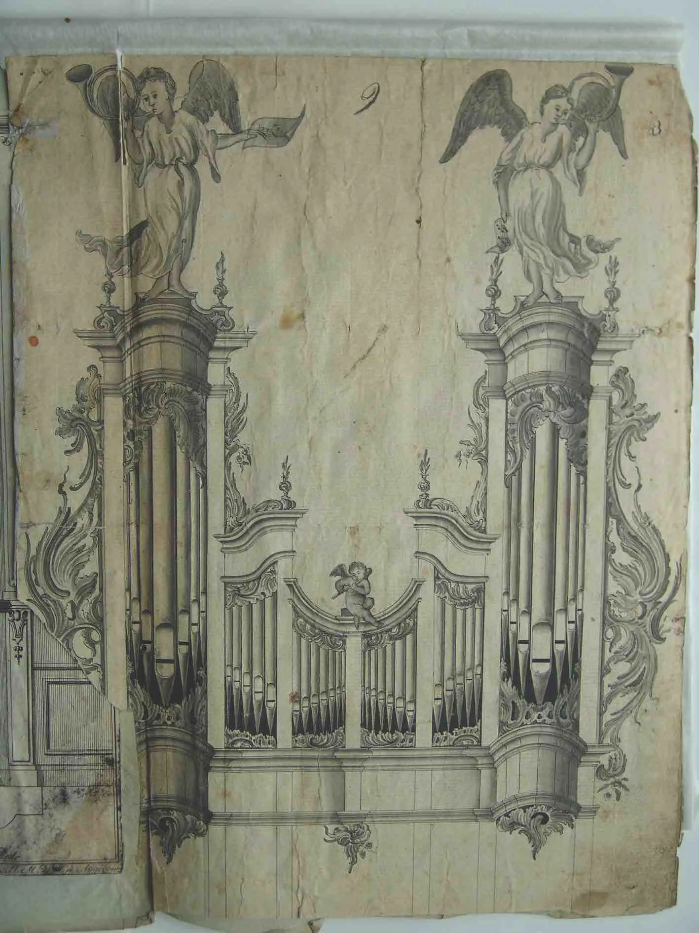 A symmetrical decorative façade design distinguishes drawing numbers 18 and 21 from the other eight designs, in which façades exhibit a lack of symmetry, with the left side being slightly different from the right one. Stylistically, these drawings are identical; undulating plant motifs, typical of late Baroque, are combined with dynamic and pliable lines characteristic of the Regency style. (It is important to note that in Lithuania Regency forms remained popular even for a few decades later than in Western Europe.) These drawings differ from each other in terms of decoration. Drawing number 21 features a group of music-making angel statues: an angelic baby in the middle is playing the flute while the other two on the sides are trumpeting. Bands of ornaments run over the base and the top of the pipes while the sides of the big towers are decorated with hollow garlands. A little angel atop the central tower is flanked by elegant vases dotted with tiny flowers, and imposing lacy wings sit on each side of the façade. Instead of music-making cherubs, the three towers of the façade are topped with wavy crowns featuring oblong cartouches in drawing number 18.