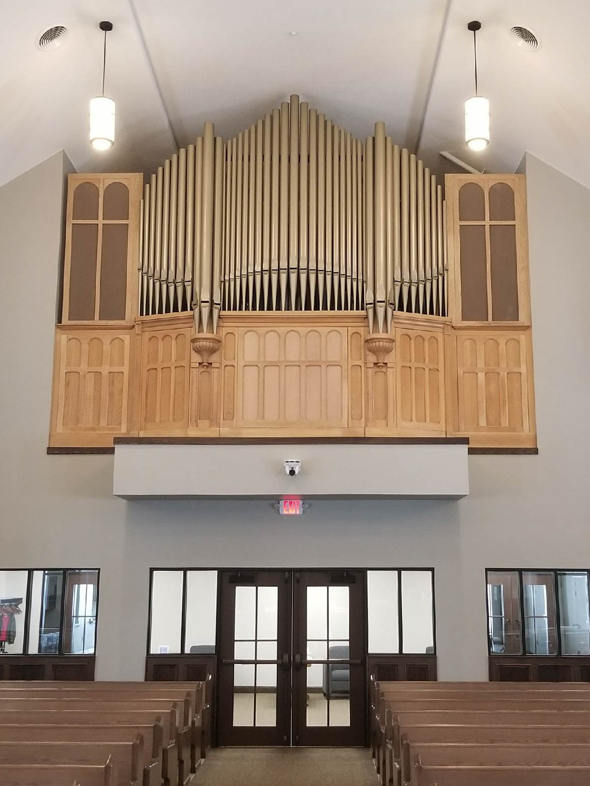 The original façade was restored. Since the 1908 organ utilized mechanical key action, new center panels matching the rest of the casework were made to fill in the location of the original keydesk. Additional space in the new organ gallery provided the opportunity to add some important new sounds to the organ to increase its versatility. A Pedal/Great 16′/8′ Trumpet, and a full-compass Swell 13⁄5′ Tierce were added; the original Aeoline was replaced by a Celeste rank. The 1960s Pedal Principal was rescaled and revoiced.