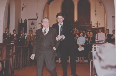 Brian’s memorial service was a reunion of dozens of colleagues, some I had not seen in years. People came from great distances to be with him in spirit one last time in that great church where it had been Brian’s childhood ambition to serve as organist. The building, designed by Henry Hobson Richardson and decorated by John La Farge, is a symphony of crotch-matched marble, painted stenciling, rich dark woodworking, and a magnificent pair of organs, Skinner Organ Company Opus 573, revised, and Aeolian-Skinner Opus 573-C. A small herd of organists took turns at the great four-manual console, and Colin Lynch, Trinity’s director of music, led a large and enthusiastic alumnae choir.