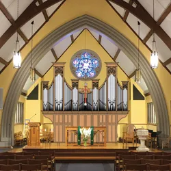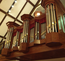 The organ’s visual design is centered on the church’s neo-Tudor gothic architecture and the recent uncovering of a stained glass window that had been hidden for almost 40 years by the church’s former organ. The Great, shown in the photograph above, is in a case hung over the balcony rail; the Swell, Choir, and Pedal are in twin cases on either side of the window.
