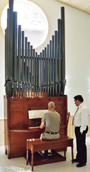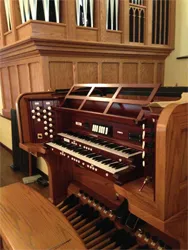 Buzard Pipe Organ Builders also announces the restoration and installation of the “Father” Willis Scudamore organ, circa 1860, at the Blue Lake Fine Arts Camp’s Musical Instrument Museum in June 2013. The organ, formerly owned by John-Paul Buzard, was cited by the Organ Historical Society for its rarity and was featured with other antique pipe organs restored by the Buzard firm at the Chicago convention of the Organ Historical Society in 2012. It has two stops (Open Diapason 8′, Principal 4′) across a single manual keyboard with pull-down pedals. The most recent restoration, undertaken prior to the organ’s installation at the camp, was of the original hand-pumped winding system and the pedalboard. David Brown, John Wiegand, and John-Paul Buzard completed the work.