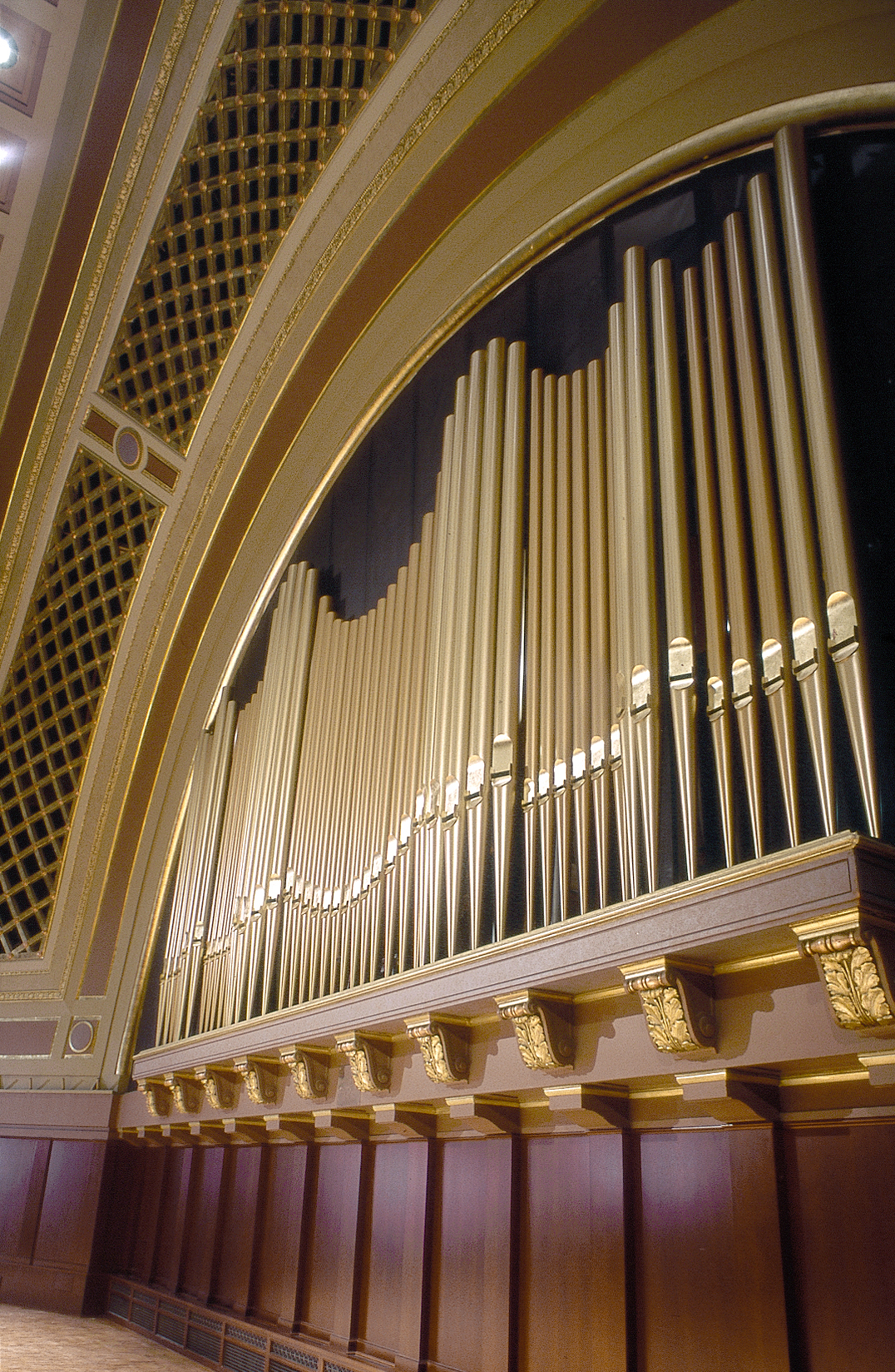 The University of Michigan will celebrate the centennial of Hill Auditorium and its Frieze Memorial Organ with a concert for the University Musical Society’s Choral Union Series on January 13. The Detroit Symphony, Leonard Slatkin, conductor, with organ soloists Peter Richard Conte, David Higgs, and James Kibbie and the Choral Union, Jerry Blackstone, director, will perform works of Barber, Bolcom, Khachaturian, MacMillan, and Bach/Stokowski. The Frieze Memorial Organ was built in 1893 by Farrand & Votey, then rebuilt by Hutchings in 1913 as the centerpiece of architect Albert Kahn’s design for Hill Auditorium. It was subsequently rebuilt and enlarged by E.M. Skinner in 1927 and Aeolian-Skinner in 1955.