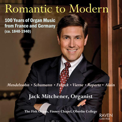 Jack Mitchener is featured on a new recording on the Raven label, Romantic to Modern (Raven OAR-958, $15.98 postpaid worldwide from RavenCD.com). Playing the Fisk organ at Oberlin College, Mitchener surveys French and German organ music ca. 1840–1940, including three rarely recorded works by Guy Ropartz (1864–1955): Introduction and Allegro moderato; Theme and Variations; and Prière, along with Mendelssohn, Schumann, Franck, Vierne, and Alain.
