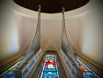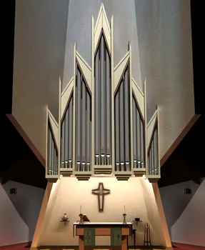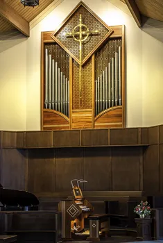 The organ comprises 24 stops, 24 ranks, and 1,331 pipes on two manuals and pedal, and includes some pipework from the church’s previous eleven-rank W. Zimmer & Sons organ.