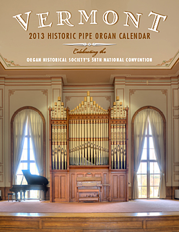 The Organ Historical Society announces the release of their Historic Pipe Organs of Vermont 2013 Wall Calendar. The calendar includes Len Levasseur’s photographs of 13 organs that will be featured in the OHS 58th national convention in Vermont from June 24 to 29. Organbuilders represented include Hutchings, Hook, Wilhelm, Estey, Fisk, Simmons, Erben, Smith, Jardine, and Desmarais. Stephen Pinel provides information on the history of organbuilding in Vermont.