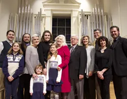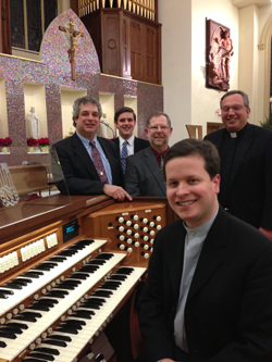 Pictured with Paul Jacobs are Patrick Murphy (president), Nicholas Will (director of music), Fredrick Bahr (tonal director), and Fr. David Poecking (pastor).