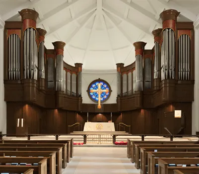 The four chancel divisions—the unenclosed Great and Pedal, and the expressive Swell and Choir—provide the basis of both choral accompaniment and hymn singing. The Resonance division is located in twin gallery caseworks high on the rear wall of the nave. The floating Celestial division cascades sound down from on high with yet another balanced Principal chorus.