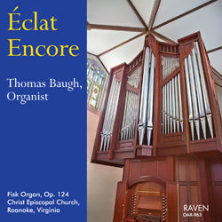 Raven Recordings announces the release of Éclat Encore, which features Thomas Baugh, organist and choirmaster at Christ Episcopal Church in Roanoke, Virginia, playing the church’s Fisk pipe organ, Opus 124 (two manuals and pedal, 27 voices, 39 ranks, 1,940 pipes).