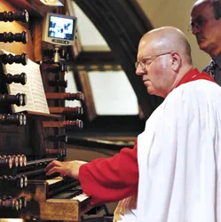 His more than 500 works ranged from the operatic, oratorio, and symphonic to choral hymns, including more than 12 works for solo organ. His Holocaust oratorio To Be Certain of the Dawn, with libretto by Minneapolis poet Michael Dennis Browne, was commissioned by the Basilica of St. Mary in Minneapolis. It was recorded by the Minnesota Orchestra, Minnesota Chorale, and Minnesota Boychoir in 2008. Paulus and his son Greg wrote a jazz-infused piece, Timepiece, to open the 2011 Minnesota Orchestra season. Pilgrim’s Hymn, his best-known choral work, was sung at the funerals of former presidents Ronald Reagan and Gerald Ford.