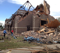 On Sunday, May 10, a tornado hit the small town of Delmont, South Dakota. Zion Lutheran Church, the tallest, most impressive landmark in Delmont, was destroyed. The Vogelpohl and Spaeth organ (II/9), much of which can be seen in the rubble pile in the accompanying photo, was totally laid waste. Although none of the pipes were salvageable, the console and chassis were picked out of the wreckage of the church and are in storage. The church has yet to decide what action they will be taking in building a new sanctuary.