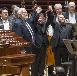 Photo: Paul Jacobs takes a bow with Christopher Rouse and Yannick Nézet-Séguin (photo credit: Jessica Griffin)