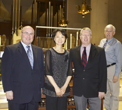 The Cathedral of Christ the King in Lexington, Kentucky, presented Yun Kyong Kim in recital on May 8. Pictured in the photo are (from left) Robert Whitaker, director of music, Yun Kyong Kim, Brian Hunt, cathedral organist, and Randall Dyer, organbuilder, following her concert. The program included works by Walton, Bonnet, Alain, Liszt, Prokofiev, Karg-Elert, Glass, and Landmann. The organ is Dyer’s III/45 instrument, built in 2012. The cathedral has an ongoing concert series.